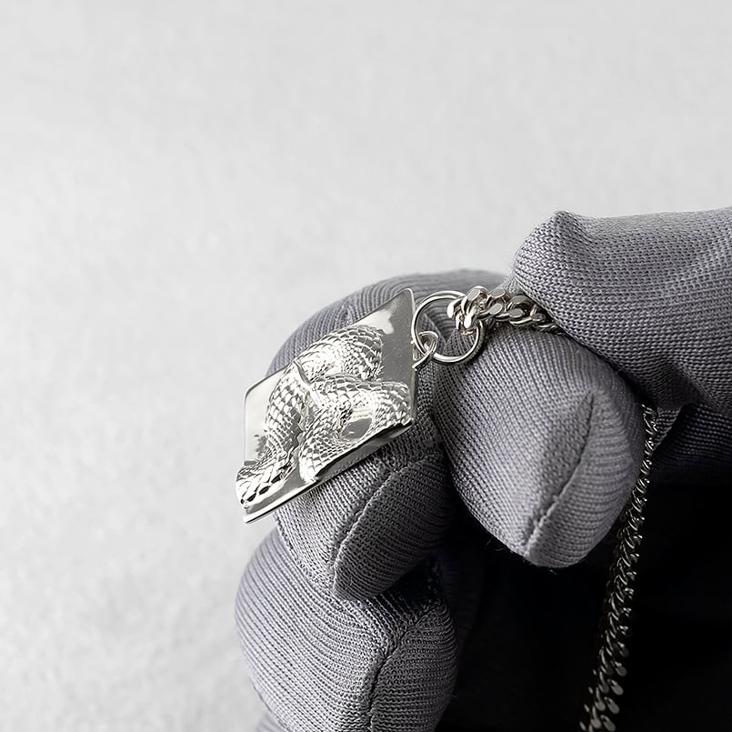 シルバーのプレートに大胆に描かれた蛇のモチーフは、まるで上から獲物を狙う大蛇を絵画に収めたかのようなデザイン。