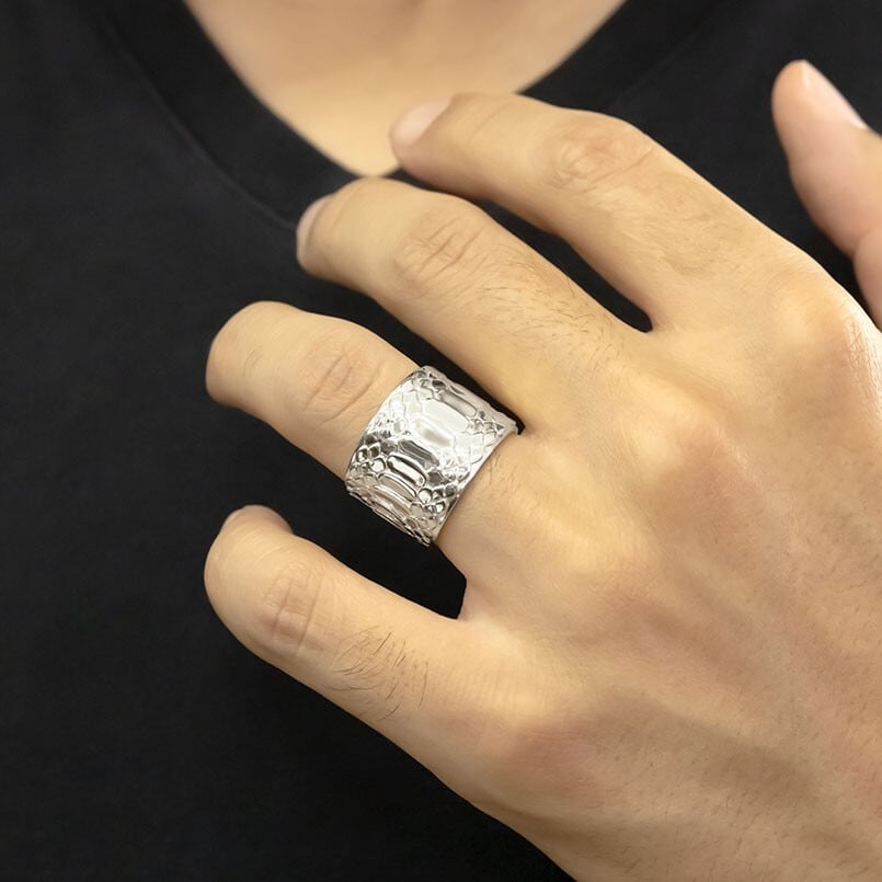 蛇柄の迫力が魅了する、指元に宿る財運と繁栄の象徴。